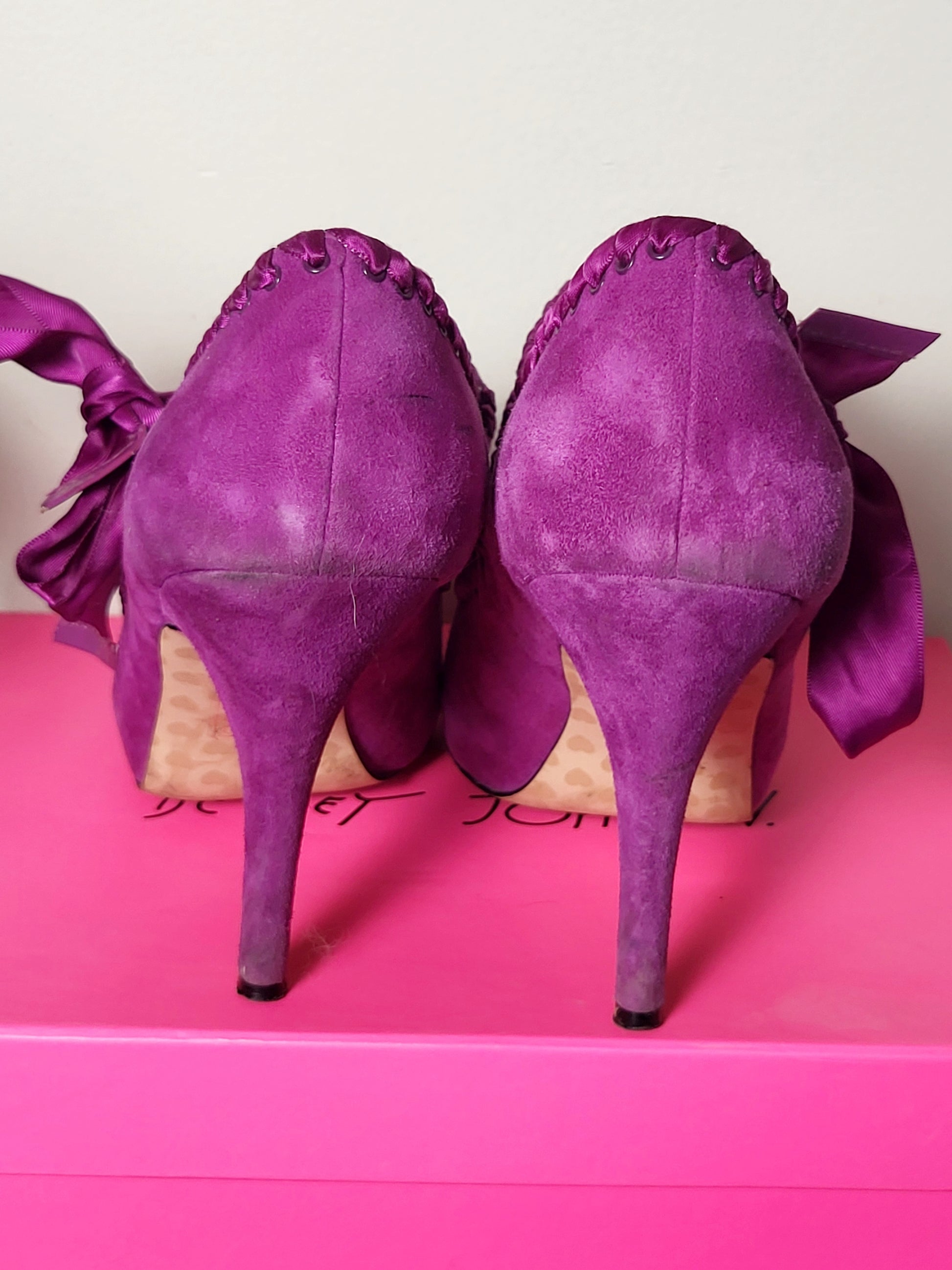 Betsey Johnson Calandria fuchsia purple suede peep-toe pumps with ribbon ankle ties. Size 9